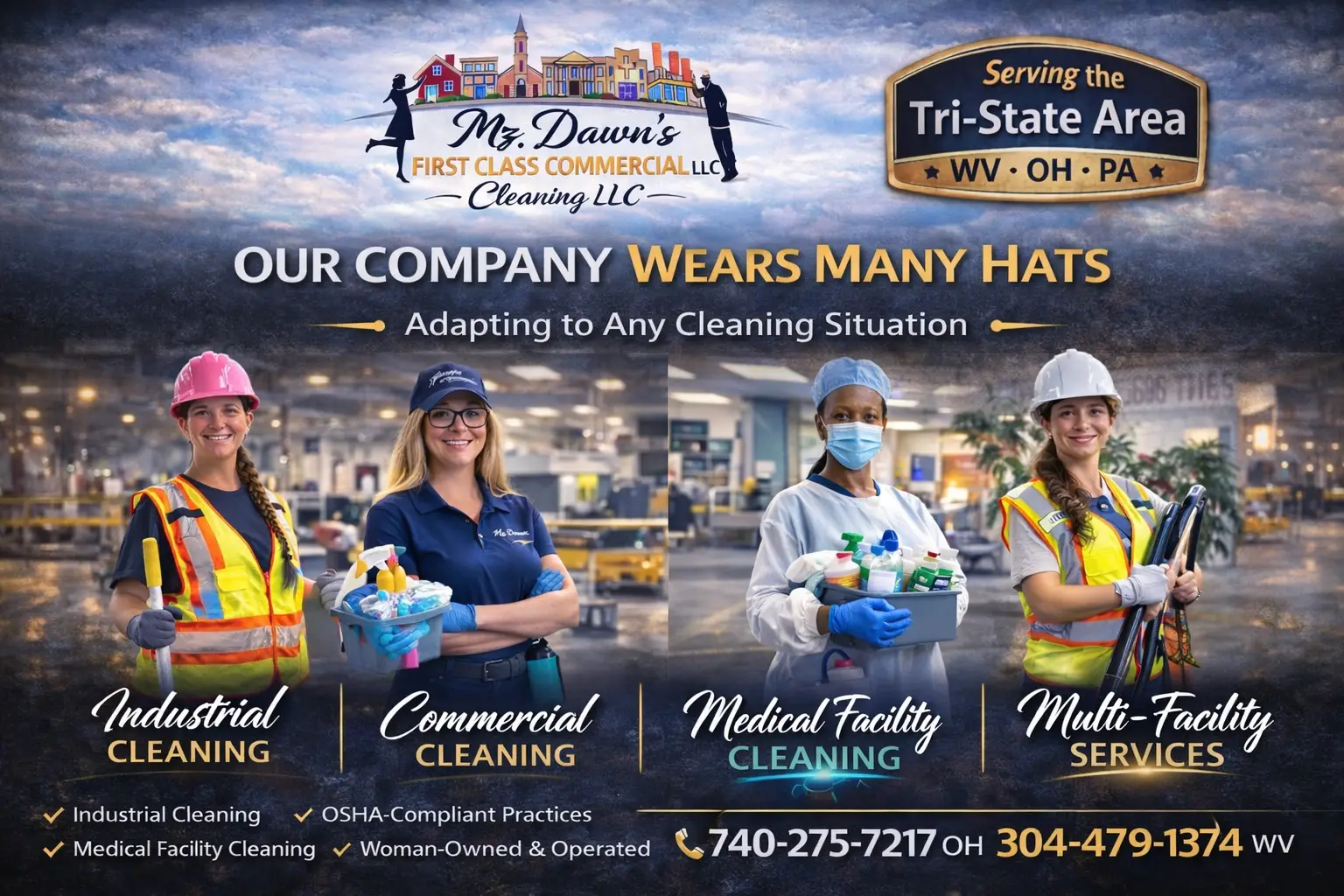 Maintaining a clean facility is important — maintaining a safe, OSHA-aligned workplace is critical. Mz. Dawn’s First Class Commercial Cleaning provides OSHA-compliant cleaning services for commercial, industrial, and medical facilities in Weirton, WV and Pittsburgh, PA. Our structured cleaning practices help reduce workplace hazards, support safety standards, and promote healthier work environments.